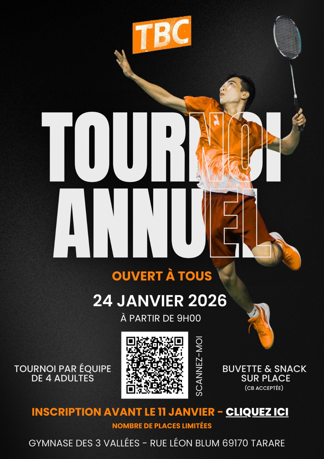 Lien HelloAsso pour l’inscription : https://www.helloasso.com/associations/tarare-badminton-club-t-b-c/evenements/tournoi-badminton-de-tarare-2026